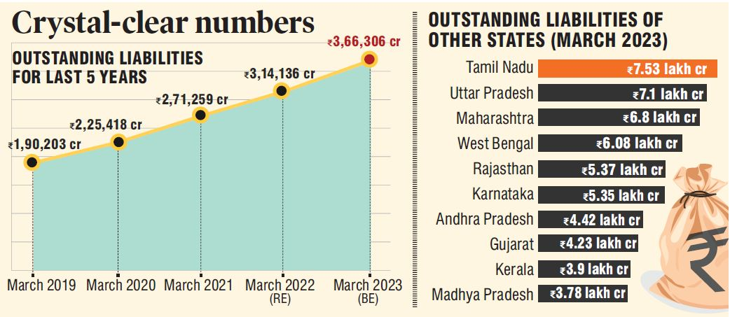 Comparatively, a number of other significant States, particularly those governed by the bjp, have enormous unpaid obligations. Furthermore, telangana does not have the highest outstanding liabilities among the States in south India. By march 2023, tamil Nadu would have the biggest outstanding obligations, totaling Rs 7.53 lakh crore. Following this are Uttar Pradesh, with 7.1 lakh crores, Maharashtra, 6.8 lakh crores, West Bengal, 6.08 lakh crores, Rajasthan, 5.37 lakh crores, Karnataka, 5.35 lakh crores, Andhra Pradesh, 4.42 lakh crores, Gujarat, 4.23 lakh crores, Kerala, 3.9 lakh crores, and Madhya Pradesh, with 3.78 lakh crores.