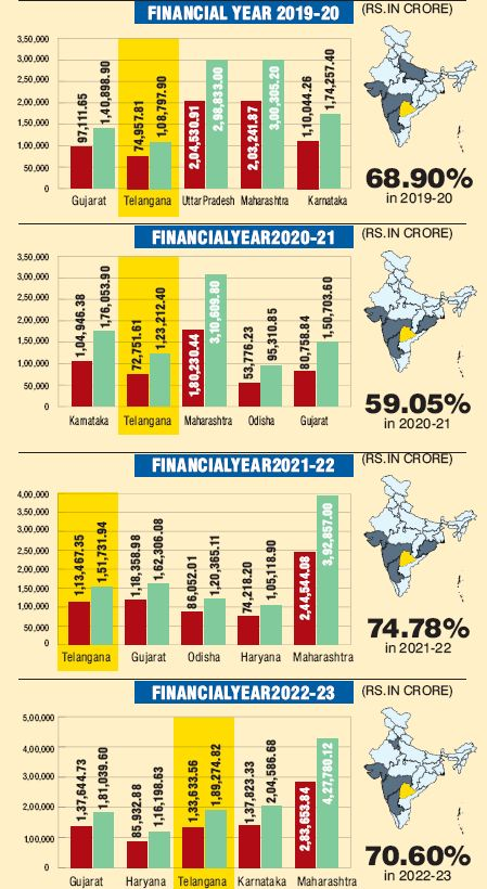 Telangana has largely competed with other major States like Maharashtra, Gujarat, Karnataka, and haryana for the top slot among the top five performing States having a higher share of their own revenue contributing to their respective revenue expenditure over the last seven financial years, according to reports by the reserve bank of india on "State Finances: A Study of Budgets for 2022-23."