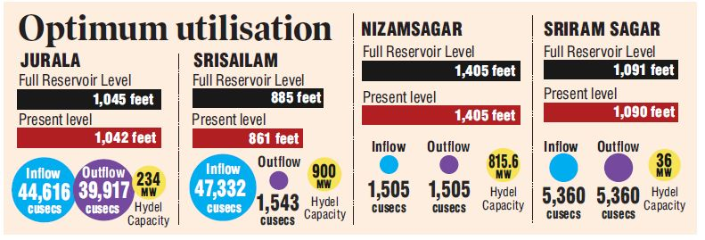 The project's input is 47,332 cusecs and its outflow is around 1543 cusecs per second. Compared to the FRL's 885 feet, it now has a water level of roughly 861 feet. The electricity generation in srisailam would start after it reaches 870 feet, according to the officials. However, power production will take some more time at the nagarjuna sagar project, which is currently receiving 8,206 cusecs inflow from upstream projects like Srisailam. The project's current water level is 515 feet compared to the FRL level of 590 feet, and power generation will start once it reaches 570 feet. The project's power plant has eight units and 815.6 MW of total installed capacity.