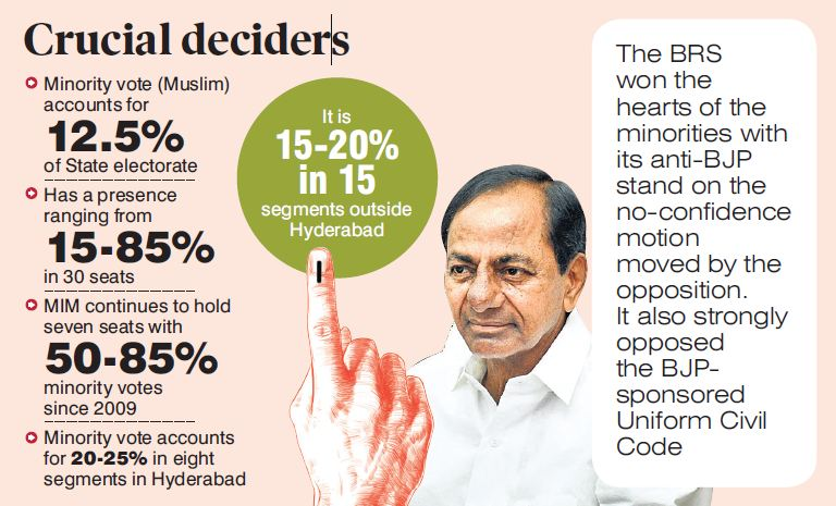 The BRS's reputation as a pro-minority political force with a strong secular leadership and furthering its ties to the AIMIM are two elements that are anticipated to benefit the ruling party at the polls. Although minority voters are significantly represented in 40 districts, their support in 23 segments is seen as crucial for the BRS to easily win.