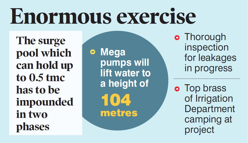 After Kaleshwaram, it will be yet another significant event in Telangana's irrigation history. The scene is now ready for the magical moment of rising water. wednesday saw the successful impounding to the target level of the first surge pool of the palamuru Ranga reddy Lift Scheme. In order to complete the crucial wet run of the mega pump house (145 MW X9) at Narlapur, the second step of impounding will be finished by Thursday. The final inspection procedure has involved both Transco and irrigation experts.