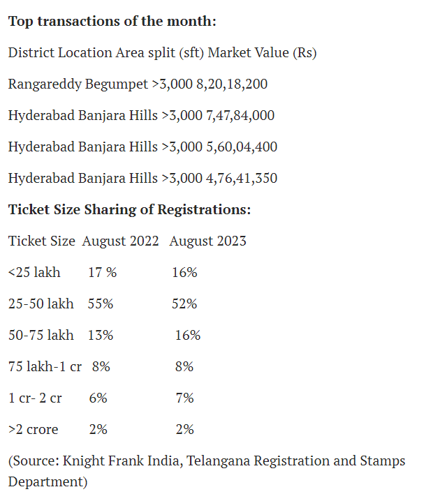 The astonishing total value of these registered properties rose by a strong 22% YoY and 20% MoM, hitting Rs 3,461 crore. The four main districts of Hyderabad—Medchal-Malkajgiri, Rangareddy, and Sangareddy—make up the hyderabad residential market. 52% of all registrations in august were for homes priced between Rs 25 lakh and Rs 50 lakh, indicating a high desire for these types of houses. 16 percent of registrations were for homes under Rs 25 lakh, while 9 percent were for houses worth Rs 1 crore or more.In terms of home sales registrations at the district level, Medchal-Malkajgiri kept up its lead with 43%, closely followed by Rangareddy with 39%. In august 2023, hyderabad district registrations made up about 17% of all registrations. A 5.7% YoY rise was seen in the weighted average price of residential units sold in August. With a 6% YoY increase, the Medchal-Malkajgiri district saw the largest price increase, followed by hyderabad and Rangareddy districts with 4% and 2% increases, respectively.