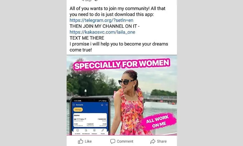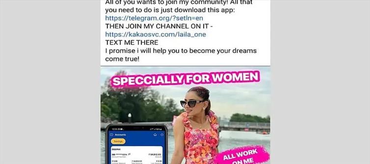 The hoax mostly uses facebook to advertise itself. Videos of the alleged laila Rao going about her daily business are posted there, with captions like, "I am an investor, amazing mum, and happy wife. "I can assist indian women with investments," a police officer claimed. They are also running channels on Telegram such as “Laila Super”, “Laila – ur investment guide”, “Laila Rao Best”, and many others.