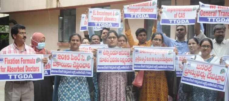 On Wednesday, protests by government doctors from several groups were conducted in the city to put pressure on the state government to quickly refund outstanding arrears, general transfers, allowances, and other concerns. A demonstration was staged here at the director of medical education's office by members of the telangana Teaching government Doctors Association (TTGDA). About 200 doctors from 26 districts joined the protesters in expressing their support for their "justified" requests.