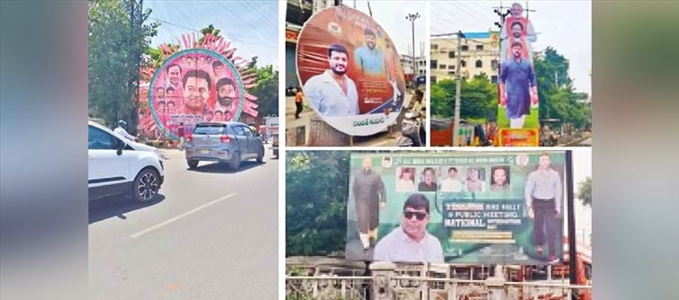 As elections get near, candidates are working harder to catch the party high command's attention. Top leaders came to the congress Working Committee (CWC) meeting, and candidates competed to build disk-shaped flexis on Road No. 1. In addition to causing traffic problems, these gave drivers blind areas. A similar large flexi struck this reporter at telangana Bhavan almost two months ago as he was walking back from The Hans india office. It was a rainy day; in the pitch-black night, a few workmen began removing a few installed flexis at the divider without giving any prior notice or caution.