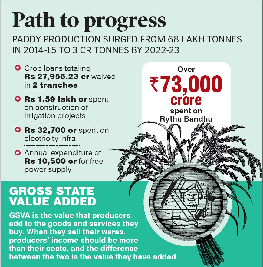 The State government's dedication to assisting its farmers is reflected in a number of measures that have aided in the expansion of the agricultural industry. Rythu Bandhu, a program that aids farmers, has deposited a remarkable Rs. 73,000 crore in their accounts over the course of 11 payments, giving them essential financial help. Additionally, since the establishment of the State, debts totaling Rs. 27,956.23 crore have been forgiven in two installments, benefitting 56.66 lakh farmers.