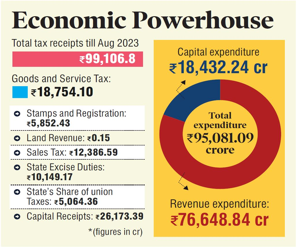 Telangana is still the country's economic powerhouse. The State's remarkable revenue total for the first five months of the fiscal year 2023–24 is Rs. 99,106.68 crore. This amounts to roughly Rs. 19,099 crore higher in income than was received during the same period the previous financial year, and it represents about Rs. 38.14% of the entire budget spending of Rs. 2,59,861,91 crore for the current fiscal.