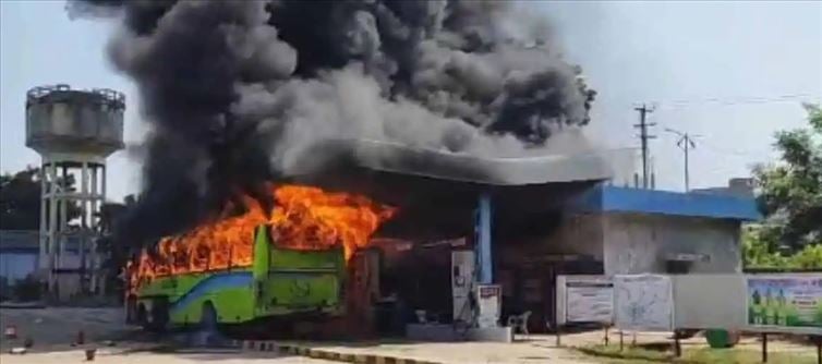 After filling up with fuel, the bus was parked next to the petrol station when it suddenly caught fire. The fire was put out when the fire department was notified by the depot officials. The authorities had completely destroyed the bus. The gasoline station was spared from the fire's progress, which may have resulted in a serious catastrophe. According to TSRTC officials, the fire may have been started by a battery short circuit.