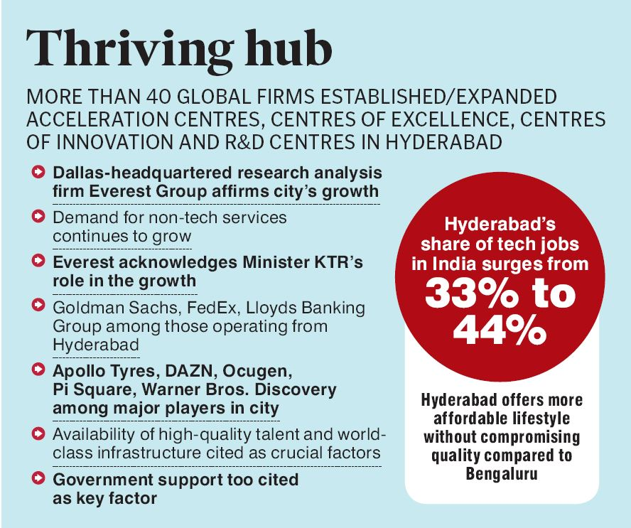 It stated that the city has demonstrated impressive growth and resilience over the past two years, recording one of the highest growth rates for global service delivery in the nation. It further stated that regular interactions between top corporate executives and IT and industries Minister KT Rama Rao demonstrate the commitment to fostering a favorable business environment. The Minister's visit to the US in May produced a number of announcements about new center installations and expansions, including those from Charles Schwab Corporation, Mondee Holdings, Storable, Rite Software, Tekgence, and Zapcom.