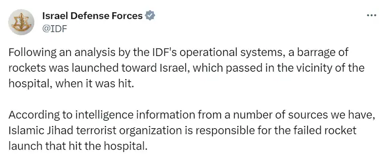 The armed group's demand to free civilian detainees came soon after an airstrike on tuesday in the Hamas-run enclave of Gaza City killed hundreds of people at a hospital. The Israeli military denied being behind the attack on a hospital in Gaza on tuesday, claiming that military information indicated the facility was struck by a botched rocket fire by the Palestinian Islamic Jihad armed organization stationed in the territory. "Following an analysis by the IDF's operational systems, a barrage of rockets was launched toward israel, which passed in the vicinity of the hospital, when it was hit," israel Defense Forces shared on X.