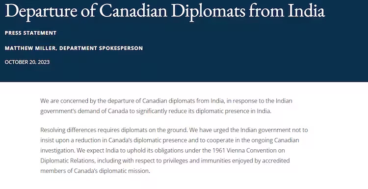 The State Department official stated, "We have urged the indian government to cooperate in the ongoing Canadian investigation and not to insist upon a reduction in Canada's diplomatic presence." "With regard to the privileges and immunities enjoyed by accredited members of Canada's diplomatic mission, we expect india to uphold its obligations under the 1961 Vienna Convention on Diplomatic Relations," Miller stated.