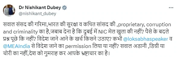"The question is about Parliament's decorum, national security, and about the MP's propriety, corruption, and criminality," Dubey stated in a hindi post. She must provide information on if NIC mails were viewed in Dubai, if money was requested, and who was responsible for paying for international travel expenditures. She must respond if she obtained approval for her travels from the Speaker of the lok sabha and the Ministry of External Affairs."