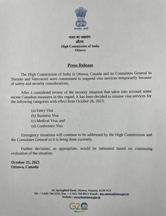 On Thursday, october 26, visa services will once again be available. "Emergency services will continue to be handled by the indian High Commission and the consulates in Toronto and Vancouver," the High Commission added in more detail. Many people, especially those who have been waiting for these services since Canadian indian visa services were banned on september 21, find great comfort in this statement.