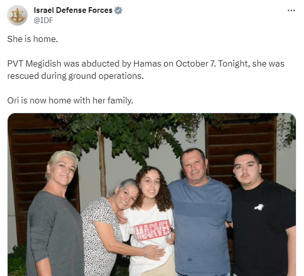 The IDF posted on X, saying, "She's back home. On october 7, PVT Megidish was kidnapped by Hamas. She was liberated tonight as ground operations were underway. Ori and her family are back at home." Hamas captured at least 240 individuals during their assault on israel nation.
