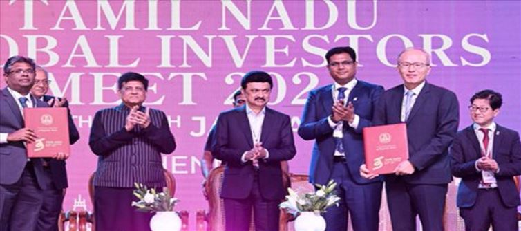 Chief minister M.K. stalin and Union Commerce minister Piyush Goyal saluting at the stage of the tamil Nadu World Investor Conference. tamil Nadu chief minister M.K.Stalin with the investors who came to the tamil Nadu World Investor Conference. Union Commerce minister Piyush Goyal, tamil Nadu industries minister D.R.P. King. The MoUs were signed in the presence of chief minister M.K. stalin and Union Commerce minister Piyush Goyal at the tamil Nadu World Investor Conference. When the leaders present at the tamil Nadu World Investor Conference in chennai appeared together on stage.