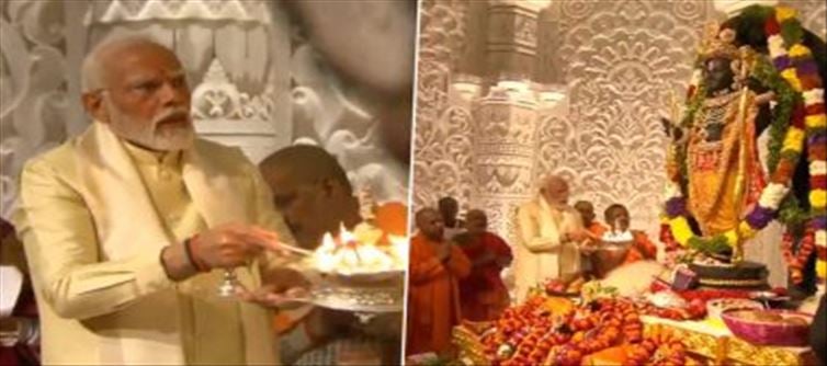 The inauguration of the newly constructed grand ram temple in Ayodhya, Uttar Pradesh and the consecration program of Ramlala was completed at an auspicious time. Today, in the presence of prime minister Narendra Modi, as per the auspicious time, Lord ram Lalla was consecrated in the sanctum sanctorum of the temple. Pandit Laxmikant Mathuranath Dixit and Ganeshwar Shastri Dravid completed the Vedic process of consecration and Ramlala was established at his original place after years. On the occasion of Ramlala's consecration, distinguished guests from across the country were also present in the temple premises. During the consecration, only five people were present in the sanctum sanctorum of the temple, these included prime minister Narendra Modi, UP governor Anandi Ben Patel, cm Yogi Adityanath, RSS chief Mohan Bhagwat. PM Modi had performed Yama penance for eleven days before his death. PM Modi had reached the sanctum sanctorum of the temple with puja material in his hands. After this the PM took part in the worship and offered lotus flowers to the adorable Shri Ram. After the Pratistha was completed at the auspicious time, the PM stayed in the sanctum sanctorum of ram Lalla for about half an hour and offered prayers.