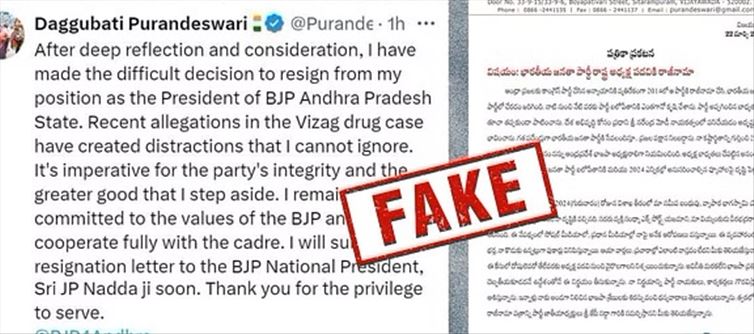 We searched for reputable news articles on the politician's resignation using pertinent keywords in telugu and English, but we were unable to uncover any. The X account of the bjp andhra pradesh confirmed that the letter was "fake" and that the resignation of purandeswari is "fake news."In the unlikely event that purandeswari had really shared and subsequently removed the message, we next looked via internet archiving services to see if the viral post had been stored.