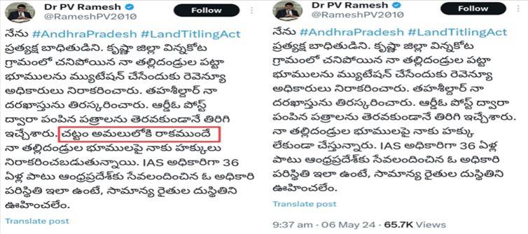 ఆ తర్వాత ల్యాండ్ టైట్లింగ్ చట్టం అమల్లోకి రాకముందే ఇలాజరిగింది అంటూ ట్వీట్ లో మార్పులు చేశారు. చట్టం అమలులోకి రాకుండానే అన్యాయం ఎలా జరుగుతుందని ఆ చట్టం గురించి ప్రస్తావించాల్సిన అవసరం ఏముందని మరి కొందరు కామెంట్లు చేస్తున్నారు. పీవీ రమేష్ తో బాటు అయన సోదరులకు కూడా భాగం ఉందని, ఈ క్రమంలో భూమి మ్యుటేషన్ కోసం వారు కూడా దరఖాస్తు చేసుకోవాలని అందుకే ఆయన భూమి మ్యుటేషన్ జరగలేదని అధికారులు చెబుతున్నారు.