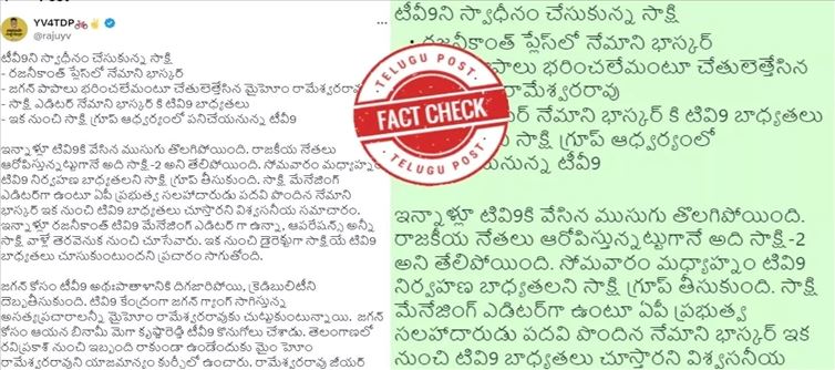 అంతేకాకుండా రజనీకాంత్ ప్లేసులో నేమాని భాస్కర్ ఉండడం చేత మరింత వైరల్ గా చేశారు. సాక్షి ఎడిటర్ నేమినేని భాస్కర్ టీవీ9 బాధ్యతలు తీసుకున్నారని ఇకనుంచి సాక్షి గ్రూప్ ఆధ్వర్యంలోనే టీవీ9 పనిచేస్తుంది అంటూ ఇన్ని రోజులకు ముసుగు తొలగిపోయింది అంటూ టిడిపి సోషల్ మీడియాలో వైరల్ గా చేస్తున్నారు. అంతేకాకుండా జగన్ కోసం టీవీ9 దిగజారిపోయింది అంటూ కూడా టిడిపి సోషల్ మీడియా ట్రోల్ చేస్తున్నారు. జగన్ బినామీలే టీవీ9 ని కొనుగోలు చేశారని విధంగా దుష్ప్రచారం చేస్తున్నారు.