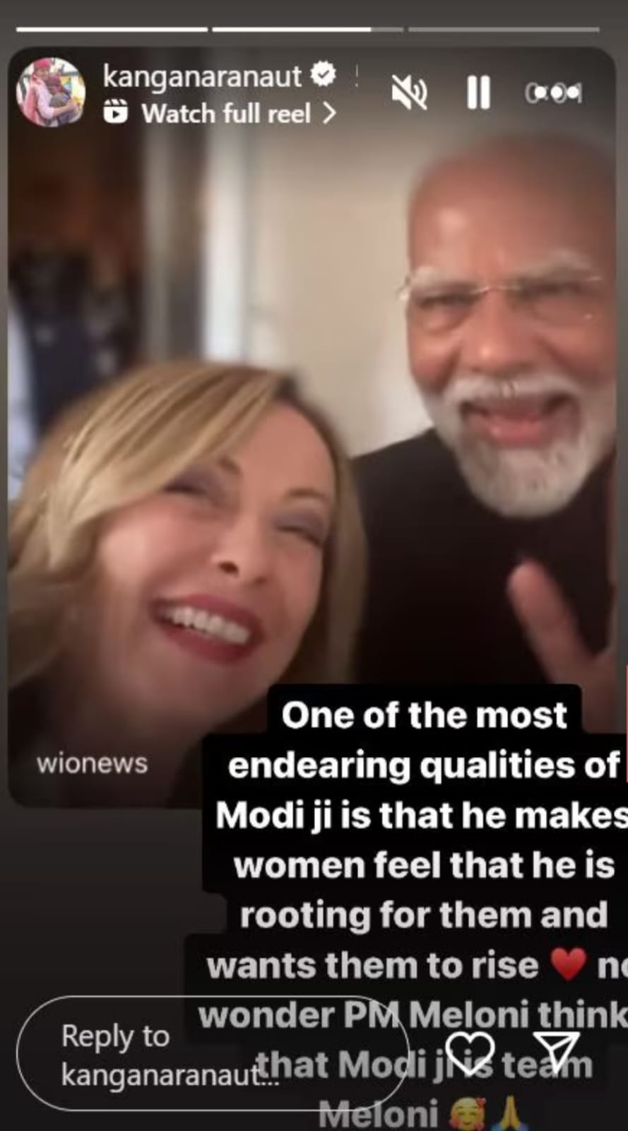 Kangana shared the video and wrote: "One of the most endearing qualities of Modi ji is that he makes women feel that he is rooting for them and wants them to rise [followed by a heart emoji]. No wonder PM Meloni thinks that Modi ji is team Meloni.”