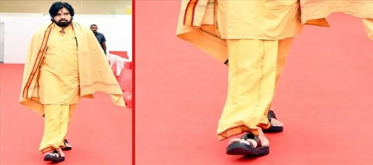 జనసేన పార్టీ అధినేత, ఆంధ్రప్రదేశ్ డిప్యూటీ సీఎం పవన్ కల్యాణ్ ఇప్పుడు వివాదంలో చిక్కుకున్నారు. ఎందుకంటే ఆయన చేపట్టిన వారాహి అమ్మవారి దీక్ష ఇప్పుడు వివాదాస్పదంగా మారింది. పవర్ స్టార్ పవన్ కల్యాణ్ వారాహి అమ్మవారి దీక్ష చేపట్టిన సంగతి తెలిసిందే.ఈ దీక్ష మొత్తం 11 రోజుల పాటు కొనసాగనుంది. వారాహి అమ్మవారి దీక్షకు సంబంధించిన ఫొటోలు కూడా సోషల్ మీడియాలో బాగా వైరల్‌గా మారాయి. పద్ధతిగా నుదుటగా బొట్టు, పసుపు రంగు అమ్మవారి బట్టల్లో కనిపించి పవన్ కళ్యాణ్ అందర్ని ఆకట్టుకున్నారు. అంతా బాగానే ఉంది కానీ ఒక తప్పు చేసి అనుకోకుండా ఓ వివాదంలో చిక్కుకున్నారు.వారాహి అమ్మవారి దీక్ష చేస్తోన్న పవన్ కల్యాణ్ చెప్పులు ధరించడం పలువురు జనాలను ఇప్పుడు షాక్‌కు గురిచేస్తుంది. పవన్ కల్యాణ్ చెప్పులు వేసుకుని అమ్మవారి దీక్ష చేయడం ఇప్పుడు పెద్ద వివాదం లాగా మారింది. పవన్ కల్యాణ్ చెప్పులు ధరించి దీక్ష చేయడం హిందువులను కించ పరచడమనే అభిప్రాయం కూడా జనాల్లో వ్యక్తం అవుతోంది.