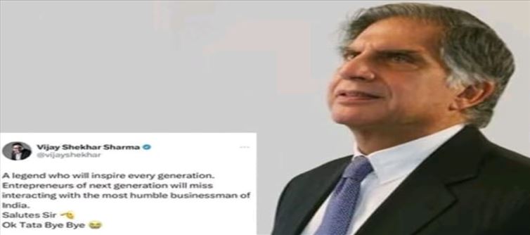 అయితే పారిశ్రామిక దిగ్గజం రతన్ టాటా మృతి పై పేటీఎం సీఈవో విజయ్ శేఖర్ శర్మ కూడా స్పందిస్తూ సోషల్ మీడియా లో పోస్ట్ పెట్టారు. అయితే ఆయన పెట్టిన పోస్ట్ మాత్రం ఎవ్వరికి నచ్చడం లేదు. అసలు మ్యానస్ ఉందా ఇదేనా ఒక లెజెండ్ కి సంతాపం తెలియ జేసే పద్ధతి అంటూ నేటిజన్స్ కామెంట్లు చేస్తున్నారట. ఇంతకీ ఆయన పెట్టిన పోస్టు లో ఏముందంటే.. ప్రతి తరానికి స్ఫూర్తినిచ్చే లెజెండ్ ను కోల్పోయాం అంటూ పేర్కొన్నారు. చివర్లో టాటా బాయ్ బాయ్ అంటూ విజయ శేఖర్ రాసుకొచ్చారు. అయితే దిగ్గజానికి వీడ్కోలు పలికే పద్ధతి ఇదేనా అంటూ అందరూ మండిపడుతున్నారు.