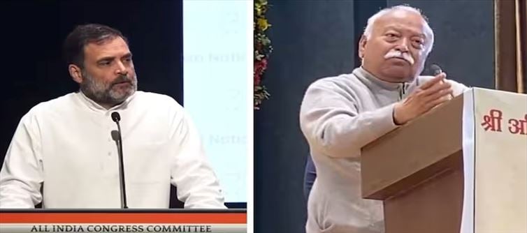 ഇന്ത്യൻ ഭരണഘടനയും ആർഎസ്എസിന്റെ പ്രത്യേയശാസ്ത്രവും തമ്മിലാണ് പോരാട്ടം; മോഹൻ ഭഗവതിനെ വിമർശിച്ച് രാഹുൽ ഗാന്ധി! മോഹൻ ഭഗവത് പറയുന്നത് രാജ്യദ്രോഹമാണ്. മറ്റൊരു രാജ്യത്തതായിരുന്നുവെങ്കിൽ അദ്ദേഹം ജയിലിൽ കിടക്കേണ്ടി വരുമായിരുന്നുവെന്നും രാഹുൽ ഗാന്ധി കൂട്ടിച്ചേർത്തു. 1947-ൽ അല്ല രാമക്ഷേത്രം നിർമ്മിച്ചതിന് ശേഷമാണ് ഇന്ത്യയ്ക്ക് സ്വാതന്ത്ര്യം കിട്ടിയതെന്ന ആർഎസ്എസ് നേതാവിന്റെ പരാമർശത്തിന് എതിരെയാണ് രാഹുൽ ഗാന്ധി രംഗത്തെത്തിയത്. ആർഎസ്എസ് നേതാവ് മോഹൻ ഭഗവതിനെ വിമർശിച്ച് കോൺഗ്രസ് നേതാവ് രാഹുൽ ഗാന്ധി. അയോധ്യയിൽ രാമക്ഷേത്രം നിർമ്മിച്ച ദിവസമാണ് ഇന്ത്യയ്ക്ക് യഥാർത്ഥ സ്വാതന്ത്ര്യം ലഭിച്ചതെന്നാണ് കഴിഞ്ഞ ദിവസം മോഹൻ ഭഗവത് പറഞ്ഞത്.