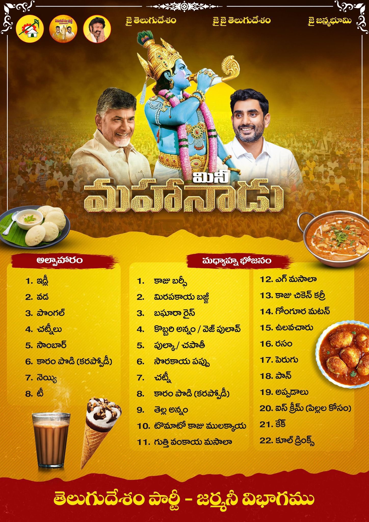అలాగే మహానాడుతో పాటుగా మినీ మహానాడులను నిర్వహిస్తూ ఉంటారు. అటువంటి మినీ మహానాడుు ఈ సంవత్సరం జర్మనీలోనూ జరగబోతుంది. ఈ మినీ మహానాడుకి జర్మనీ మరియు జర్మనీ సరిహద్దు ఇతర దేశాల్లో ఉన్న తెలుగుదేశం కుటుంబ సభ్యులందరూ హాజరు కానున్నారు. ఈ నేపథ్యంలోనే టీడీపీ జర్మనీ విభాగం నోరూరించే రుచులతో `మినీ మహానాడు మెనూ`ను సోషల్ మీడియా ద్వారా పంచుకుంది. అది కాస్త ఇప్పుడు వైరల్ గా మారింది.
