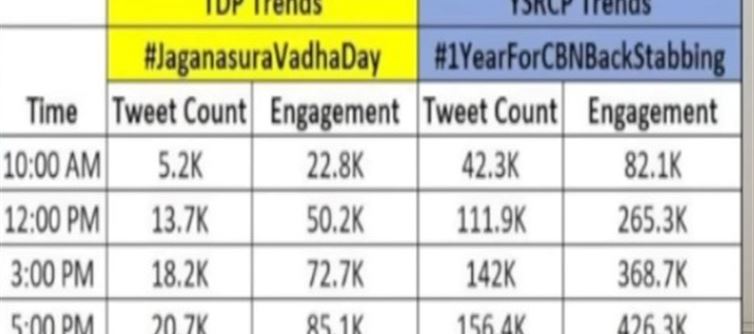 ఇందులో ఉదయం 10 గంటలకు ట్విట్కౌంటు.. టిడిపి వాళ్లకి సంబంధించి 5.2k ఉండగా ఎంగేజ్మెంట్ 22.8k ఉంటే.. అదే సందర్భంలో వైసీపీ వాళ్లకు సంబంధించి ట్రెండ్ లోకి వచ్చేసరికి..42.3k ట్వీట్ కౌంట్ ఉన్నది.. ఇక ఎంగేజ్మెంట్ విషయానికి వస్తే 82.1k ఉన్నది. ఆ తర్వాత 12 గంటల సమయానికి 13.7k ట్విట్టర్ కౌంట్..50.2 ఎంగేజ్మెంట్.. వైసిపి పార్టీ విషయానికి వస్తే..111.9 k ట్విట్టర్ కౌంట్.. ఎంగేజ్మెంట్ 265.3k కలిగి ఉన్నది.. ఇక సాయంత్రం 5 గంటల విషయానికి వస్తే టిడిపి ట్విట్టర్ కౌంట్ 20.7k ఉండగా ఎంగేజ్మెంట్ 85.1k కలదు.. వైసిపి ట్విట్టర్ కౌంట్ విషయానికి వస్తే..156.4k ఎంగేజ్మెంట్ 426.3k కలదు. తద్వారా వైసిపి పార్టీని బాగా సక్సెస్ అయినట్టుగా కనిపిస్తోంది.