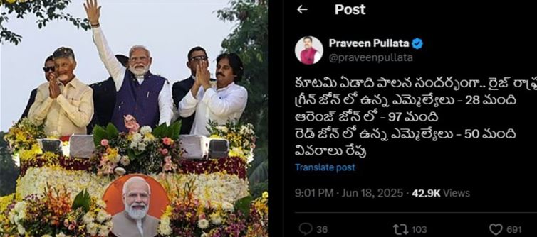 అయితే ప్రవీణ్ పుల్లట్ల తెలిపిన ట్విట్టర్ ప్రకారం కూటమి ఏడాది పాలన సందర్భంగా రైజ్ రాష్ట్రవ్యాప్తంగా జరిపిన సర్వేలో గ్రీన్ జోన్ లో 28 కూటమి ఎమ్మెల్యేలు కేవలం 28 మందిని తెలిపారు.. అలాగే ఆరంజ్ జోన్ లో ఉన్న ఎమ్మెల్యేలు 97 మంది అంటూ తెలిపారు.. ఇక రెడ్ జోన్ డేంజర్ జోన్ లో ఉన్న ఎమ్మెల్యేలు 50 మంది ఉన్నారని తెలియజేశారు. అయితే ఇందుకు సంబంధించి పూర్తి వివరాలు తాము తెలపలేమంటూ తెలిపారు .కానీ కూటమి ప్రభుత్వం పైన ఏడాది పాలనకు ఇలాంటి రివ్యూలు ఇవ్వడంతో అందరూ ఆశ్చర్యపోతున్నారు.