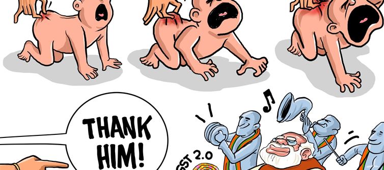 The cartoon implies that while the public (represented by the babies) suffered under initial GST implementations (pain of higher taxes and compliance difficulties), the political leadership seeks public gratitude for evolving and promoting the new GST reforms.
