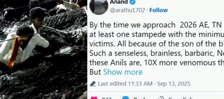 ఈ నేపథ్యంలో, “ఆనంద్” అనే ట్విట్టర్ అకౌంట్ నుండి సెప్టెంబర్ 13న చేయబడిన ట్వీట్ సోషల్ మీడియాలో వైరల్ అయింది. ఇప్పుడు ఈ ట్వీట్ బిగ్ సెన్సేషన్ గా మారింది. ట్వీట్లో, ఈ ఘటన ముందే జరుగుతుందని తెలిపారు. ఆనంద్ తెలిపిన వివరాల ప్రకారం.." తమిళనాట భారీ తొక్కిసలాట జరగబోతుంది. 50 మంది యువత బలైపోయే దారుణం జరగబోతుంది. డిఎంకే కంటే 10 రెట్లు విషపూరితమైన విజయ్ వల్లే ఇది జరగబోతుంది"అంటూ పోస్ట్ చేశారు. పోలీసులు ప్రస్తుతం ఈ ట్వీట్ నిజంగా ఆధారాలతో చేశారా..? లేక సాధారణంగా చేసారా..? ఈ దుర్ఘటన ముందే జరగబోతోందని తెలుసుకుని చేయబడిందా అనే విషయంపై విచారణ చేస్తున్నారు.