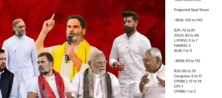 తాజాగా JVC అనే ఒక ప్రముఖ సర్వే సంస్థ నిర్వహించినటువంటి సర్వేలో ఎన్డీఏ కూటమికి 120 నుంచి 140 సీట్లు వస్తాయని, ఇందులో బిజెపి 70, జెడియూ 42 నుంచి 48 సీట్లు వస్తాయని, LJP 5 నుంచి7 సీట్లు, హెచ్ఏఎం 2 సీట్లు, ఆర్ఎల్ఎం ఒకటి లేదా రెండు స్థానాలు వచ్చే అవకాశం ఉన్నట్లు అంచనా వేస్తోంది. అలాగే మహాఘట్ బంధం కూటమికి 93 నుంచి 112 సీట్లు వచ్చే అవకాశం ఉన్నట్లుగా అంచనా వేస్తోంది. అయితే ఇందులో ఆర్జెడి 69 నుంచి 78 స్థానాలు, కాంగ్రెస్ 9 నుంచి 17 స్థానాలు, సిపిఐ 12 నుంచి 14 స్థానాలు ఇతర పార్టీలకు ఒకటి లేదా రెండు సీట్లు వచ్చే అవకాశం ఉన్నట్లు అంచనా వేస్తున్నారు. ఇక ప్రశాంత్ కిషోర్ నేతృత్వంలో వచ్చినటువంటి జెన్ సూరజ్ పార్టీ కేవలం ఒక్క స్థానంలో గెలుస్తుందని అంచనా వేస్తున్నారు. AIMIM, BSP ఇతర పార్టీలు 8 నుంచి 10 స్థానాల్లో గెలిచే అవకాశం ఉన్నట్లుగా అంచనా వేస్తోంది జేవిసి సర్వే.