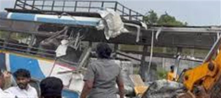 A tragic collision occurred near Khanapur Gate in Telangana’s ranga reddy district when a gravel-laden truck collided head-on with a TGSRTC bus.