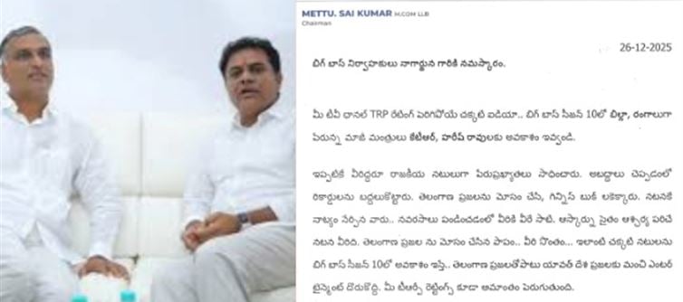 తెలంగాణ ప్రజలను మోసం చేసిన పాపం వారి సొంతమని ఆరోపిస్తూ, ఇలాంటి “చక్కని నటీనటులకు” బిగ్ బాస్ వంటి రియాలిటీ షో వేదిక మరింత సరైనదని సాయి కుమార్ వ్యాఖ్యానించారు. బిగ్ బాస్ సీజన్–10లో వారికి అవకాశం ఇస్తే ప్రేక్షకులకు పూర్తి స్థాయి ఎంటర్టైన్మెంట్ లభిస్తుందని ఆయన తన లేఖలో పేర్కొన్నారు.హరీశ్ రావు, కేటీఆర్లు బిగ్ బాస్ హౌస్లో అడుగుపెడితే షో టీఆర్పీలు అన్ని రికార్డులను బద్దలు కొడతాయని సాయి కుమార్ సెటైరికల్గా వ్యాఖ్యానించారు. వారి మాటలు, ప్రవర్తన, నటన ప్రేక్షకులకు ఓ ప్రత్యేక అనుభూతిని అందిస్తాయని చమత్కారంగా రాసుకొచ్చారు.
