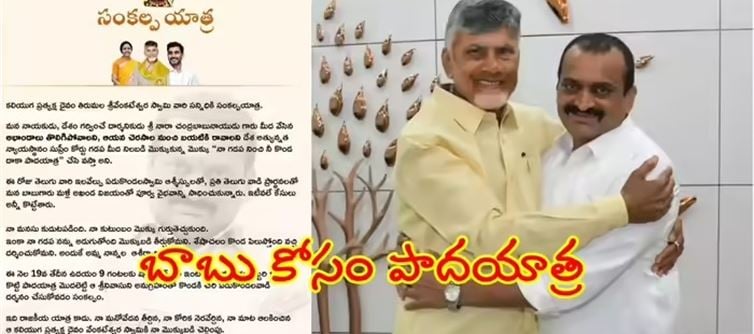 పూర్తి వివరాలలోకి వెళితే బండ్ల గణేష్ రాసిన లేఖలో.. కలియుగ ప్రత్యక్ష దైవం తిరుపతి వెంకటేశ్వర స్వామి సన్నిధికి సంకల్పయాత్ర అనే పేరుతో మొదలుపెట్ట..మన నాయకుడు దేశం గర్వించే నాయకుడు నారా చంద్రబాబు నాయుడు మీద వేసిన అబాండాలు తొలగిపోవాలని ఆయన చెరసాల నుంచి బయటికి రావాలని , అత్యున్నత న్యాయస్థానం సుప్రీంకోర్టు గడప మీద నిలబడి తాను ఈ మొక్కు మొక్కుకున్నానని.. నా గడప నుంచి నీ కొండ దాకా పాదయాత్ర చేసి వస్తానని.. వెంకటేశ్వర స్వామి ఆశీస్సులతో ప్రతి తెలుగు వాడి ప్రార్థనలతో చంద్రబాబు మళ్ళీ అఖండ విజయంతో పూర్వ వైభవాన్ని అందుకున్నారు. తన కేసులన్నీ కూడా కొట్టేశారు. దీంతో నా మనసు కుదిటపడిందని తెలిపారు.