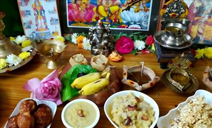 Prior to the Pooja, the houses are cleaned and washed completely. The entrance, as well as the interior of the house, is decorated with maa kolams. The festival begins with fasting, that continues till the sunset. In the afternoon, special dishes are prepared for offering to the lord (neivedhyam). In the evening, the entire house is lighted with beautiful oil lamps. Each of the lamps has its own mythological significance. The various lamps lit during the occasion include Lakshmi Vilakku, Kuththu Vilakku, Gajalakshmi Vilakku and Aanai Vilakku.