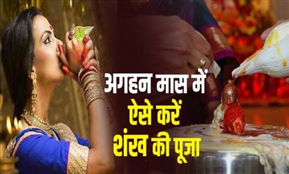 मंगलवार 15 नवंबर से मार्गशीर्ष महीने की शुरुवात हो चुकी है। ये महीना या कहें मास अपने आप में बहुत महत्वपूर्ण है। इस मास को भगवानों ने खुद की संज्ञा दी है। ऐसा कहा जाता है श्रीमद्भागवतगीता में सभी महीनों में से मार्गशीर्ष महीने को श्रीकृष्ण का स्वरूप बताया गया है। अब ऐसे में सवाल ये है कि आखिर इस महीने में हम कैसे देवताओं को प्रसन्न करें ? कैसे हम अपने घर मे धन की बारिश करें। तो आपको बता दें कि श्री कृष्ण को शंख बहुत प्रिय है। साथ ही साथ माता लक्ष्मी को भी शंख बहुत पसंद है। ऐसे में अगर आप शंख की पूजा करते हैं तो माता लक्ष्मी प्रसन्न होकर आपको मालामाल कर सकती हैं। पौराणिक कथाओं में ऐसा लिखा है कि माता लक्ष्मी के भाई शंख है। इस हिसाब से देखें तो शंख का महत्व अपने आप बढ़ जाता है। अब आपको बताते हैं कि आखिर किस विधि से शंख की पूजा करें ताकि आप पर हो धन की वर्षा