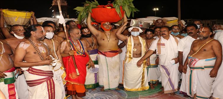 శ్రీవారి ఆలయంలో వేకువనే ప్రారంభమైంది. ఉదయం 2.30 నుంచి నామకోపు, శ్రీ చూర్ణం, కస్తూరి పసుపు, పచ్చాకు, గడ్డ కర్పూరం, గంధం పొడి, కుంకుమ, కిచీలిగడ్డ తదితర సుగంధ ద్రవ్యాలు కలగలిపిన మిశ్రమాన్ని తయారు చేశారు... దీనినే పరిమళం అని కూడా అంటారు. ఈ పరిమళపు ముద్దను తొలుతగా విమాన ప్రాకారంలో ఊరేగింగి , ఆపై శ్రీవారి వక్ష:స్థల లక్ష్మీ అమ్మవారికి ఏకాంతంగా తిరుమంజనం నిర్వహించారు. ఆ తరువాత ఉదయం 4.30 గంటల ప్రాంతంలో తిరుమల శ్రీవారి ఆలయం నుంచి పసుపు, కుంకుమ, ప్రసాదాలు, తులసి, వస్త్రాలు, ఆభరణాలతో కూడిన సారె ఊరేగింపు ఆరంభమైంది. ఈ సారెను ఎనుగులపై ఉంచి ఆలయ నాలుగు మాడ వీధులలో ఊరేగించారు.. అక్కడ నుంచి కాలినడకన తిరుపతిలోని అలిపిరి వద్దకు తీసుకెళ్లారు. ఆ తరువాత కోమలమ్మ సత్రం, తిరుచానూరు పసుపు మండపం మీదుగా తిరుచానూరు ఆలయం వద్ద అమ్మవారికి సారె సమర్పించారు. ఆభరణంతో కూడిన శ్రీవారి సారెను అలిపిరి వద్ద అదనపు ఈవో శ్రీ ఎవి.ధర్మారెడ్డి తిరుపతి జెఈవో శ్రీ వీరబ్రహ్మంకు అందజేశారు. శ్రీ పద్మావతి అమ్మవారి ఆలయం వద్ద ఆయన ఈవో డాక్టర్ కె.ఎస్.జవహర్ రెడ్డికి జెఈవో అందించారు.