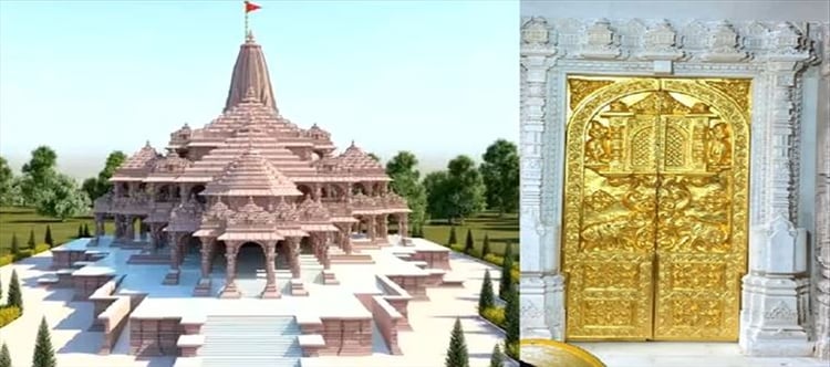 अगले तीन दिनों के भीतर राम मंदिर में गर्भगृह के बड़े आकार के द्वार सहित 13 स्वर्ण दरवाजे स्थापित किए जाएंगे। सामने आई तस्वीर में सुनहरे दरवाजे के मध्य पैनल पर दो हाथी स्वागत मुद्रा में नजर आ रहे हैं। ऊपरी भाग में एक महल जैसी आकृति दिखाई देती है जिसमें दो द्वारपाल हाथ जोड़े खड़े हैं। वहीं, दरवाजे के नीचे बने चार चौकों में खूबसूरत कलाकृतियां खुदी हुई हैं।