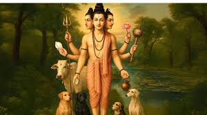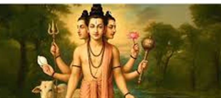 · Often depicted with three heads representing Brahma, Vishnu, and shiva, he embodies knowledge, power, and renunciation.