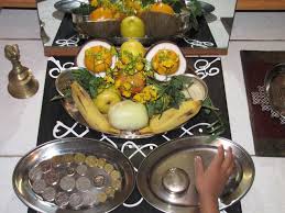 A traditional feature is the âKanniâ arrangement, where auspicious items like fruits, flowers, gold, and mirror are viewed first thing in the morning to bring good luck.