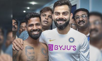जानकरी के अनुसार इस फैन का नाम पिंटू राज है, ओडिशा के रहने वाले पिंटू ने अपने शरीर पर करीब 15 टैटू बनवाए हैं। मुलाकात के वक्त विराट ने पिंटू को गले लगा लिया। विराट के पहले सचिन तेंदुलकर के सुधीर गौतम और महेंद्र सिंह धोनी के राम बाबू भारतीय भी चर्चा में रह चुके हैं। भारतीय खिलाड़ियों के प्रति फैंस की दीवानगी तो हद से ज्यादा है मगर कुछ कुछ फैन ऐसे है जो एक मिसाल ही बन जाते हैं और चर्चा में आ जाते हैं।