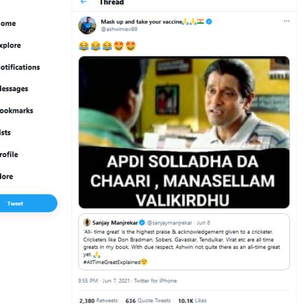 He unwantedly dragged Ashwin's name into the picture. Ashwin immediately posted a reply by taking a meme from the tamil movie 'Anniyan' (in hindi it is Aparachith!) and gave a fitting reply with another tweet. He made a sarcastic post with that meme and it started to go viral on social media. Ashwin never stopped there as he continued to explain that meme to other language audiences as well. Stay tuned for more updates.