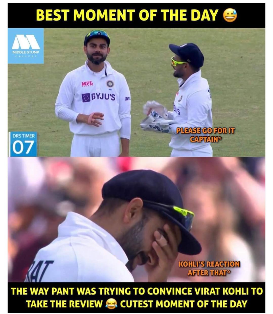21 వ ఓవర్ చివరి బంతి సమయంలో, సిరాజ్ చాలా మంచి డెలివరీతో జాక్ క్రాలీని ఆశ్చర్యపరిచాడు.క్రాలీ రిషబ్ పంత్కి తీసుకువెళ్ళే స్పష్టమైన లోపలి అంచుని పొందాడు. కుడి చేతి బ్యాట్స్మన్ డెలివరీకి ఆలస్యంగా స్పందించాడు మరియు ప్రత్యర్థికి తన వికెట్ను బహుమతిగా ఇచ్చాడు.ప్రారంభంలో, ఆన్-ఫీల్డ్ అంపైర్ తన వేలు పైకి లేపడానికి సంశయించాడు. అయితే, ఈ సమీక్షపై భారత కెప్టెన్ విరాట్ కోహ్లీ జాగ్రత్త వహించాడు. పంత్ ఆన్-ఫీల్డ్ కాల్ను సవాలు చేయమని కెప్టెన్ను ఒప్పించాడు. థర్డ్ అంపైర్ తన నిర్ణయాన్ని రద్దు చేయాలని ఆన్-ఫీల్డ్ అంపైర్ని కోరాడు. ఇక ప్రస్తుతం ఇది దీనికి సంబంధించిన వీడియో నెట్టింటా తెగ వైరల్ అవుతుంది. కోహ్లీ, పంత్ ది డెడ్లీ కాంబినేషన్ అని నెటిజన్స్ కామెంట్స్ చేస్తున్నారు. ఇక వైరల్ అవుతున్న వీడియోని మీరు చూసేయండి.ఇక తరువాత 27 పరుగులు చేసిన తర్వాత క్రాలీ నిష్క్రమించాడు. లంచ్ సెషన్కు ముందు ఇంగ్లాండ్ 61/2 (25 ఓవర్లు) స్కోర్ చేయగలిగింది.అలాగే వైరల్ అవుతున్న ఈ మీమ్ కూడా చూసేయండి.