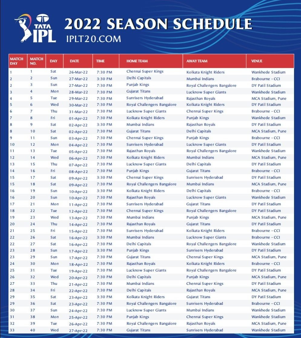 The Board of Control for cricket in india has released the schedule of the indian Premier League 2022. This time all the matches on the league stage will be played in mumbai and Pune. In total, there will be 70 league matches, four playoff matches.