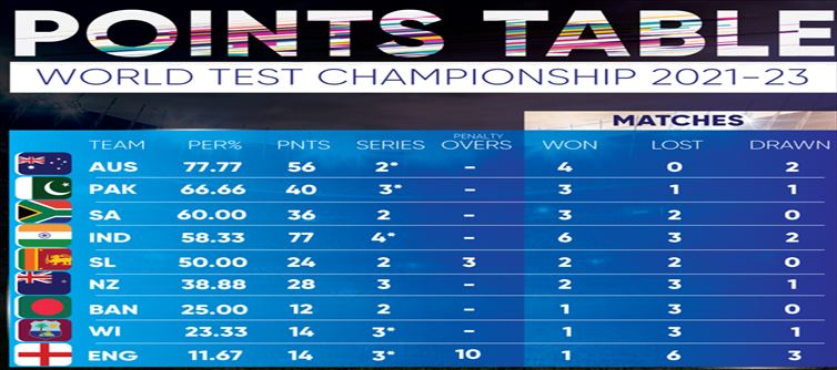 The indian team is in fourth place with 58.33 percent. Received 77 points. The indian team has played 9 Tests so far in the 2021 - 2023 Test championship series. It has won 6 of those matches. It has lost 3 matches and drawn 2 matches. It has also participated in 4 series. australia tops the list with 77.77 percent, according to the current statistics. The Australian team has 56 points. In second place is the pakistan team. That team has 66.66 percent. Received 40 points. In third place is the South African team. That team has 60 percent. The South African team has 36 points. india is in fourth place.