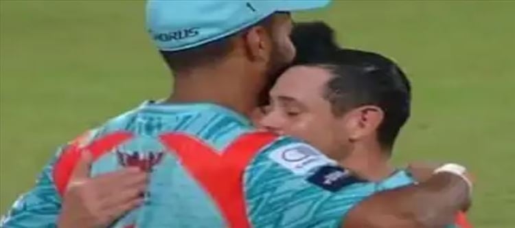 తొలి బంతిని కవర్స్ లో కి ఆడిన క్వింటన్ డికాక్ సింగిల్ కు రావాల్సిందిగా మరో ఎండ్ లో ఉన్న కేఎల్ రాహుల్ ని పిలిచాడు. అయితే కేఎల్ రాహుల్ పిచ్ మధ్య వరకూ వచ్చాడు. అయితే బంతి శ్రేయస్ అయ్యర్ చేతుల్లోకి వెళ్ళిపోయింది దీంతో రాహుల్ ను వెనక్కి వెళ్లాల్సిందిగా క్వింటన్ డికాక్ సూచించాడు. దీంతో అప్రమత్తమైన కె.ఎల్.రాహుల్ తిరిగి క్రీజులోకి చేరుకునే ప్రయత్నం చేశాడు. కానీ శ్రేయస్ అయ్యర్ త్రో విసిరి వికెట్లను తీశాడు. దీంతో ఇక కేఎల్ రాహుల్ ఒక్క బంతి కూడా ఆడకుండానే రనౌట్ అయ్యాడు. తన వల్లే రాహుల్ రనౌట్ అయ్యాడు అని క్వింటన్ డికాక్ బాధపడ్డాడు. స్ట్రాటెజీక్ టైం అవుట్ సమయంలో మైదానంలోకి వచ్చిన రాహుల్ ను క్షమించాలి అంటూ కోరాడు క్వింటన్ డికాక్. దీనిపై పెద్ద మనసుతో చేసుకుని రాహుల్ క్వింటన్ డికాక్ ను హగ్ చేసుకుని పర్వాలేదు అన్నట్టుగా చెప్పాడు. దీనికి సంబంధించిన ఫోటో ఫైనల్ గా మారిపోయింది..