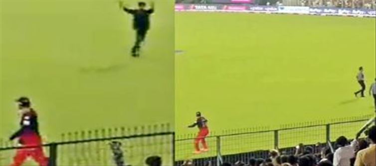లక్నో బ్యాటింగ్ చేస్తున్న సమయంలో బెంగళూరు మాజీ కెప్టెన్ విరాట్ కోహ్లి బౌండరీ లైన్ వద్ద ఫీల్డింగ్ చేస్తున్న సమయంలో అతని వద్దకు ఒక అభిమాని పరుగెత్తుకు వచ్చాడు. అది చూసిన కోహ్లీ అతనికి దూరంగా వెళ్ళాడు. సెక్యూరిటీ పిలిచి ఆ వ్యక్తిని స్టేడియం నుంచి తీసుకెళ్లాలని అరిచాడు. అక్కడికి వచ్చిన సెక్యూరిటీ సిబ్బంది వడ్ల బస్తా ను భుజంపై ఎత్తుకొన్నట్లుగా అతని తీసుకెళ్లాడు. ఇది చూసి కోహ్లీ నవ్వుకున్నాడు. అభిమానుల వైపు తిరిగి డబ్ల్యూఈడబ్ల్యూఈ జాన్ సేనా తరహాలో అదిరిపోయే యాక్షన్ ఇచ్చాడు. దీనికి స్టేడియం లో ఉన్న అభిమానులు నవ్వులు చిందించారు. ఈ వీడియో కర్త వైరల్ గా మారిపోయింది..