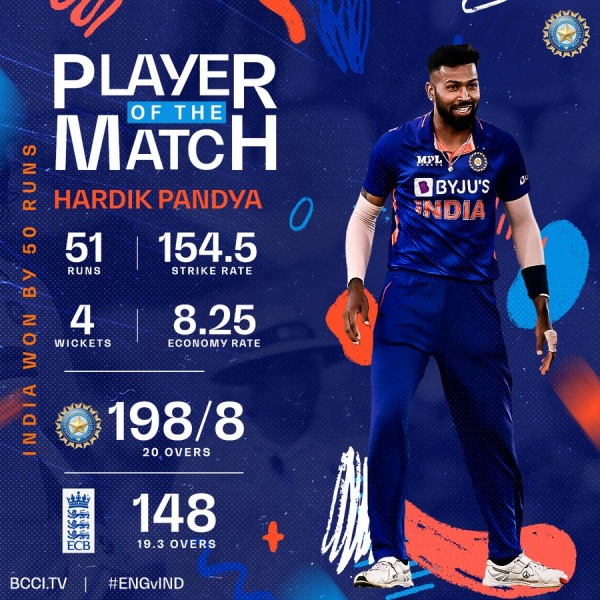 The england team, which set out for a tough target, failed to face the bowling of the indian team and fell one after the other. With Jason Roy (4), Jos Buttler (0), david malan (21), and Livingston (0), the top order collapsed badly. After this Harry Brook (28) and moeen ali (36) added runs and the team was all out for 148 runs. The indian team won by 50 runs.
